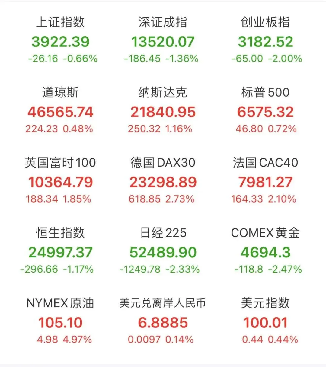 大A这边低开低走,三大指数全跌,四千多只股票下跌,只有八百只左右上涨;油气开采板块逆势走强,贵金属、半导体等前期热门板块回调。黄金市场大起大落,伦敦金早盘冲到4800美元/盎司新高后跳水,石油方面,受川普表态将对伊朗能源设施实施 “极猛烈” 打击的影响,国际油价大涨,WTI原油涨超5.9%,国内原油期货则高位窄幅震荡,基本持平。