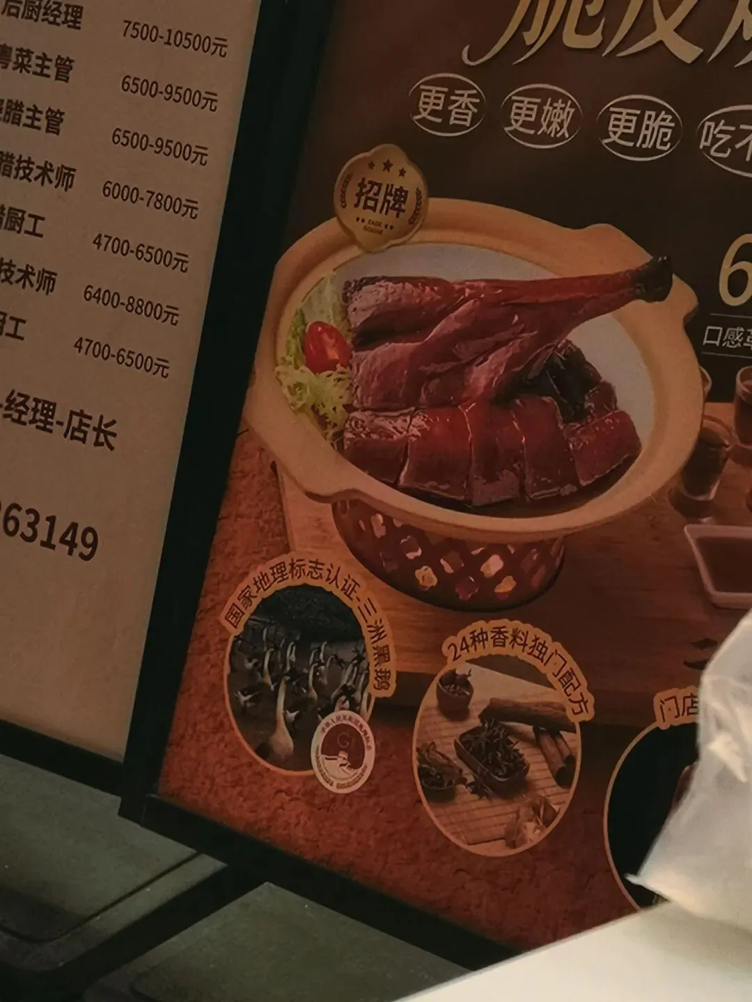 这个“二十四香烧鹅”是最近开得挺多的一个烧腊连锁,据说背后老板有来头。烧鹅主打用高明的三洲黑鹅,属于黑棕鹅的一个品种。黑鬃鹅个头不大,比起马岗鹅会显得肉更加嫩,没马岗鹅的肉粗,是鹅中上品。