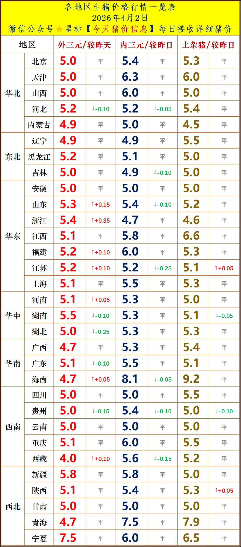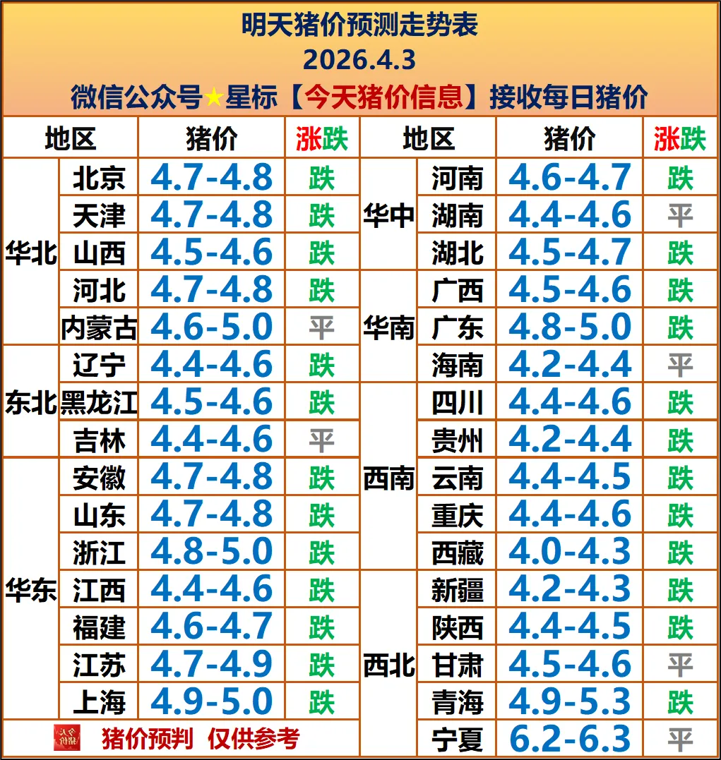 明天(4 月 3 日)全国猪价稳中偏弱,延续震荡磨底态势。短期难有大幅反弹,区域分化持续,华东、华南部分区域维持 4.6-5.2 元 / 斤,北方产区多在 4.4-4.8 元 / 斤,海南价格相对低洼。