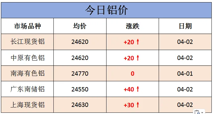 >今日铝价行情!铝锭 氧化铝价格(2026.4.2)