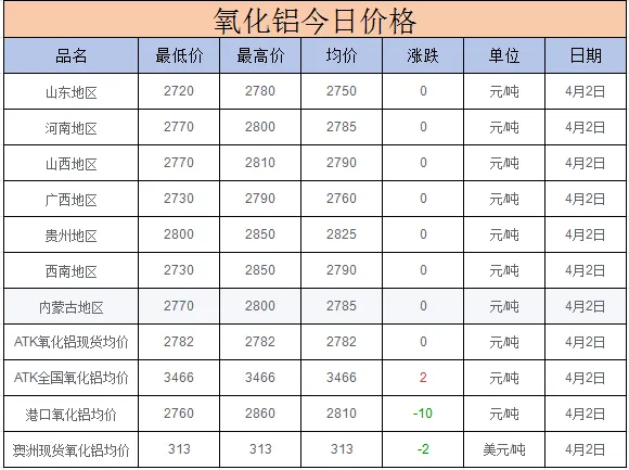 今日铝价行情!铝锭 氧化铝价格(2026.4.2)