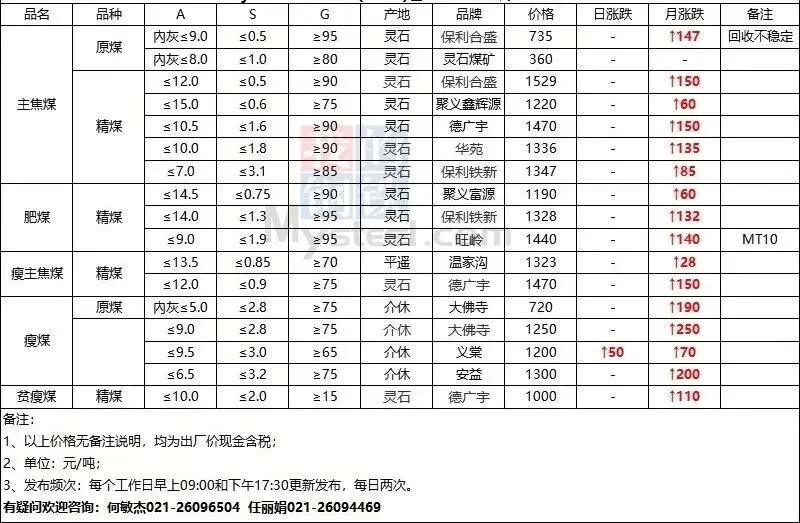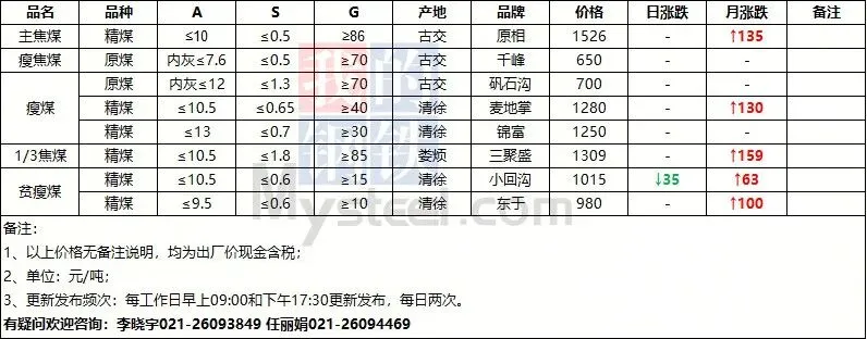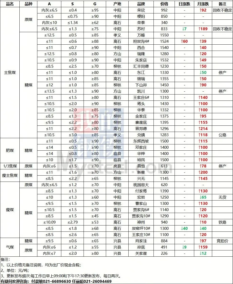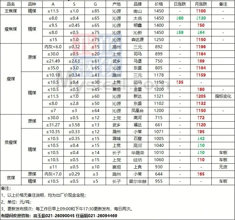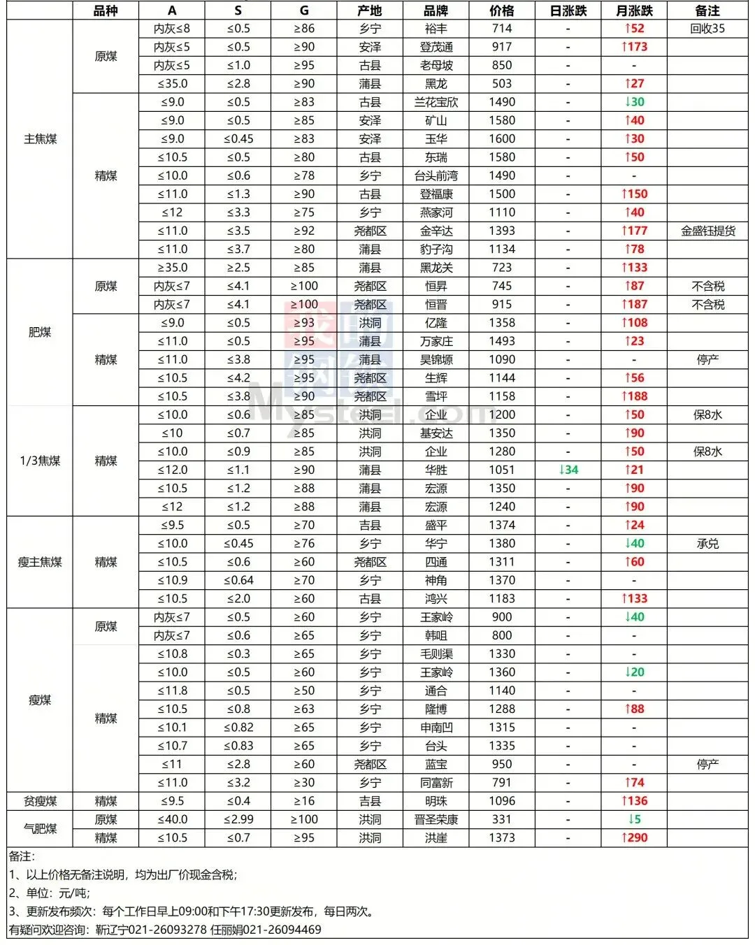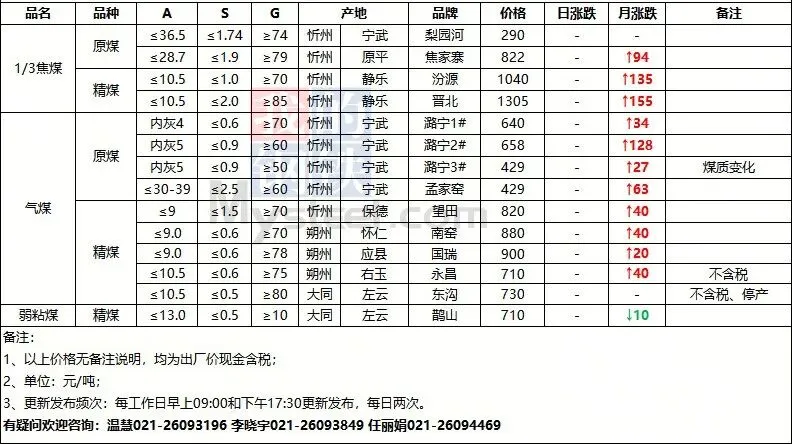 - 市场价格:临汾低硫焦精煤市场价格一季度均价1559元/吨,同比上涨14.7%;长治低硫贫瘦精煤市场价格一季度均价1006元/吨,同比上涨2.1%。