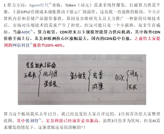 1 算力方向,昨天算力板块大涨,优刻得,宏景科技盘中表现不俗,今天虽然垮下来,我认为依然是情绪影响,整体得逻辑还在,这个方向,我从去年春晚前就反复点评,一直到年后,波折虽多,但是整体状态应该算是较为活跃,消息催化非常多,可以继续关注,以低吸高抛为主!