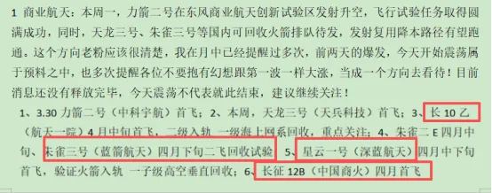 2 商业航天 昨夜美股商业航天概念整体走势还好,今天A股市场商业航天走出分歧,但是神剑,天银依然翻红,除了马斯克的SpaceX的IPo上市预期,本月后期的密集发射也将继续催化,其实这个板块我们在讨论的时候,分歧意见比较大,这个毕竟是0-1的炒预期过程,但是我认为,如果一旦成功,那么就是1-100的业绩释放!下图划红线是可回收火箭,期待成功!