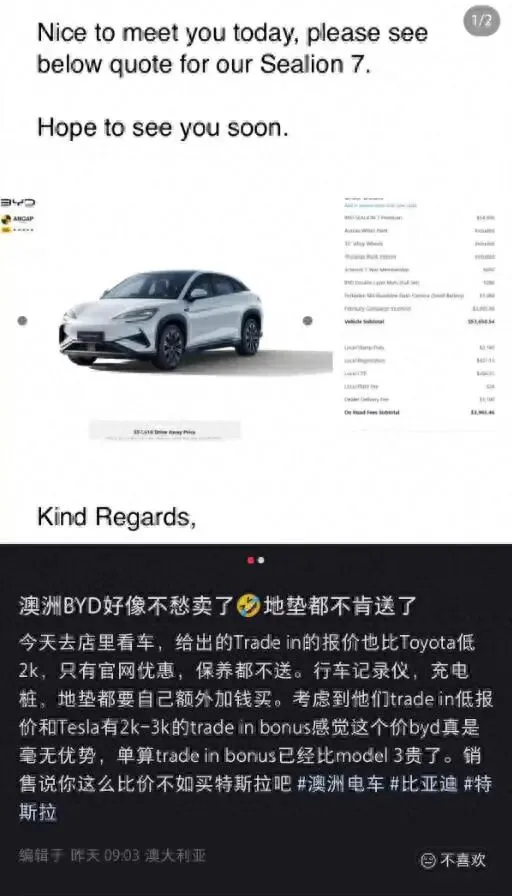 我在开头给大家复述的这段话,是我最近在小地瓜上刷到的一条帖子。贴主是一位IP定位在澳大利亚的网民,他最近想入手一台新车,于是本着货比三家的心态,分别去丰田、比亚迪和三家都打听了一下。