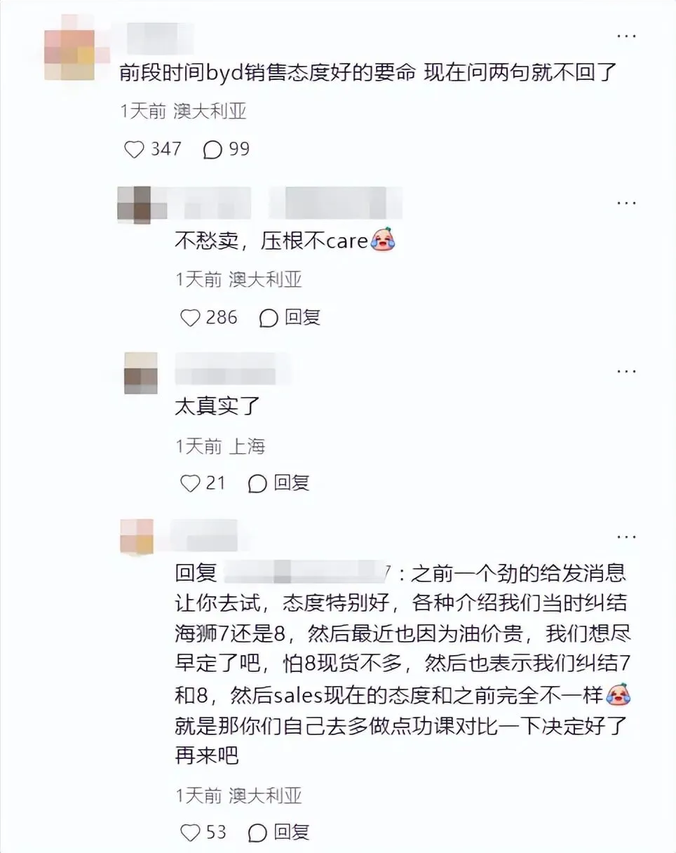 “之前一个劲地给发消息让你去试,态度特别好,各种介绍我们当时纠结海狮7还是8,然后最近也因为油价贵,我们想尽早定了吧,怕8现货不多,然后也表示我们纠结7和8,然后销售现在的态度和之前完全不一样。张口就是:‘那你们自己去多做点功课,对比一下,决定好了再来吧’。”