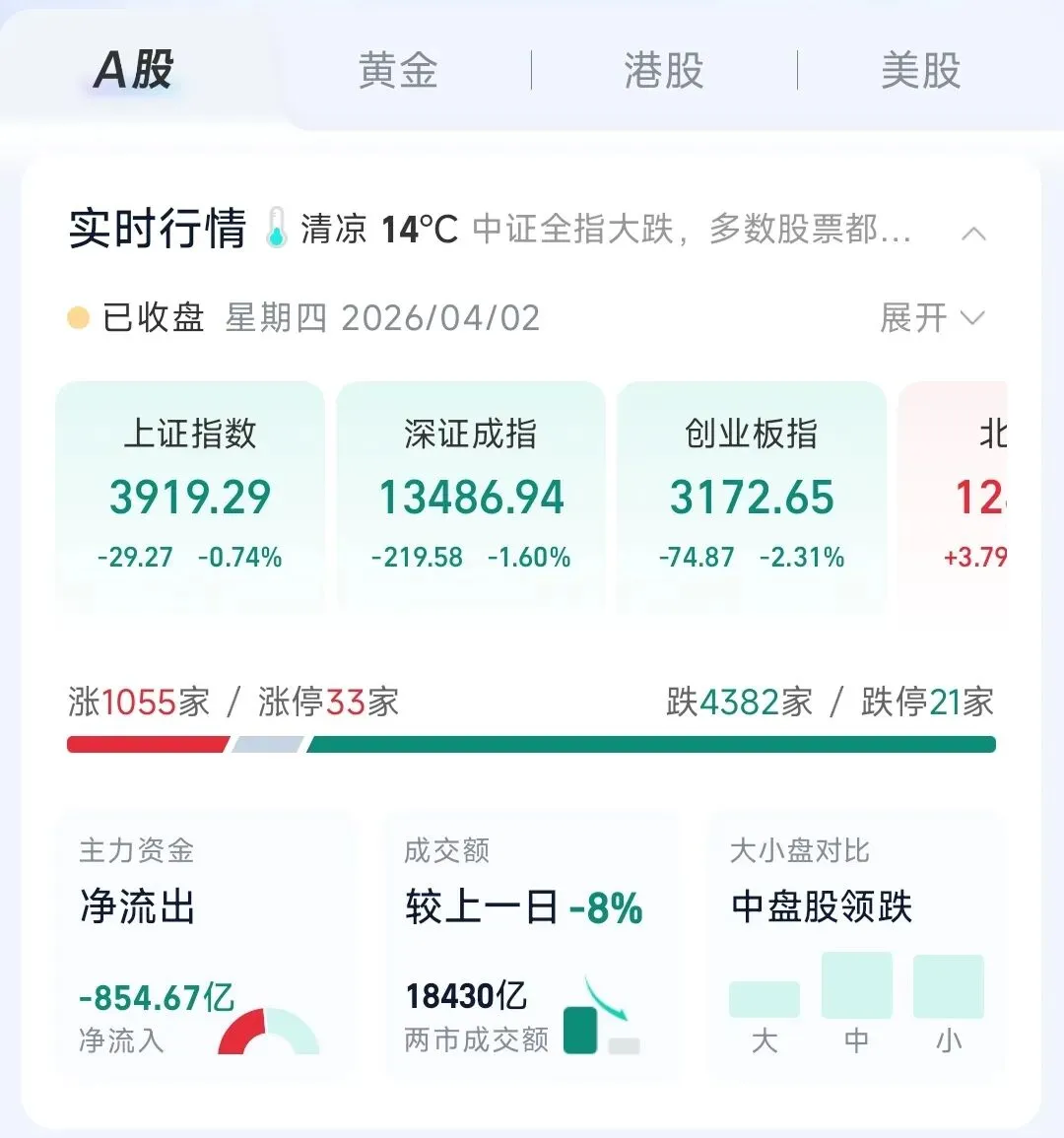 1. 上证指数:收报3919.29点,下跌0.74%。上证指数今天低开后稍作反弹,然后就是一路向下,直到下午2点才止跌企稳,最终跌幅有所收窄。