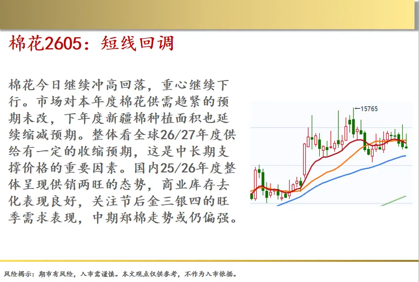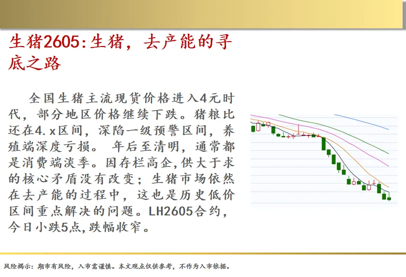 全国生猪主流现货价格进入4元时代,部分地区价格继续下跌。猪粮比还在4.x区间,深陷一级预警区间,养殖端深度亏损。 年后至清明,通常都是消费端淡季。因存栏高企,供大于求的核心矛盾没有改变;生猪市场依然在去产能的过程中,这也是历史低价区间重点解决的问题。LH2605合约,今日小跌5点,跌幅收窄。