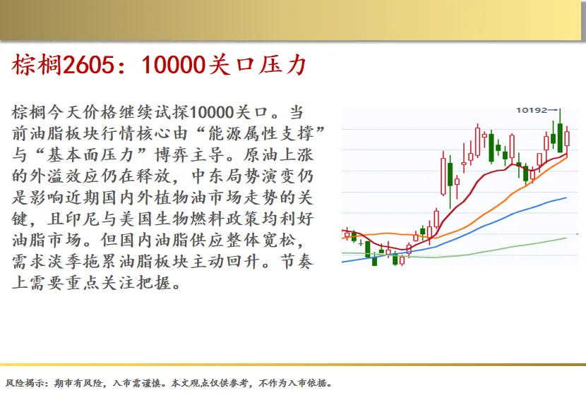 棕榈今天价格继续试探10000关口。当前油脂板块行情核心由“能源属性支撑”与“基本面压力”博弈主导。原油上涨的外溢效应仍在释放,中东局势演变仍是影响近期国内外植物油市场走势的关键,且印尼与美国生物燃料政策均利好油脂市场。但国内油脂供应整体宽松,需求淡季拖累油脂板块主动回升。节奏上需要重点关注把握。