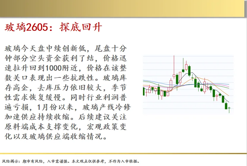 玻璃今天盘中续创新低,尾盘十分钟部分空头资金获利了结,价格迅速拉升回到1000附近,价格在该整数关口表现出一些抗跌性。玻璃库存高企,去库压力依旧较大,季节性需求恢复缓慢。同时行业利润普遍亏损,1月份以来,玻璃产线冷修加速供应持续收缩。后续建议关注原料端成本支撑变化,宏观政策变化以及玻璃供应端收缩情况。