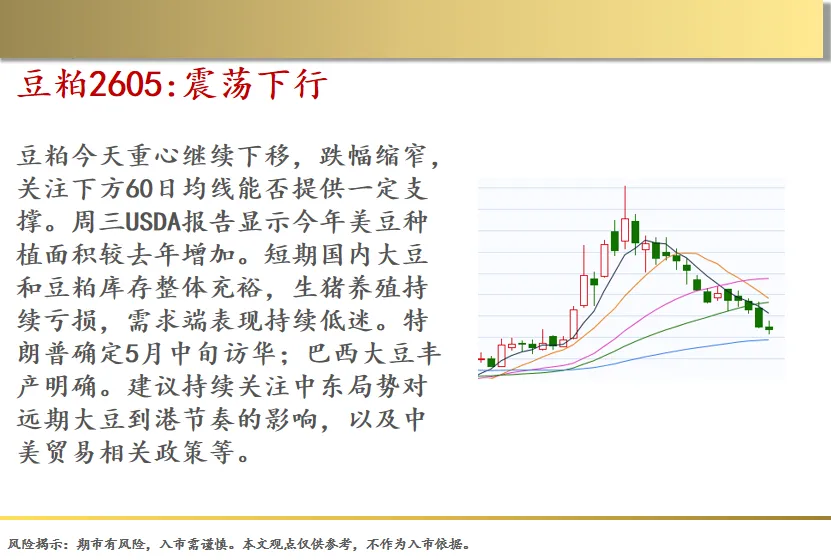 豆粕今天重心继续下移,跌幅缩窄,关注下方60日均线能否提供一定支撑。周三USDA报告显示今年美豆种植面积较去年增加。短期国内大豆和豆粕库存整体充裕,生猪养殖持续亏损,需求端表现持续低迷。特朗普确定5月中旬访华;巴西大豆丰产明确。建议持续关注中东局势对远期大豆到港节奏的影响,以及中美贸易相关政策等。