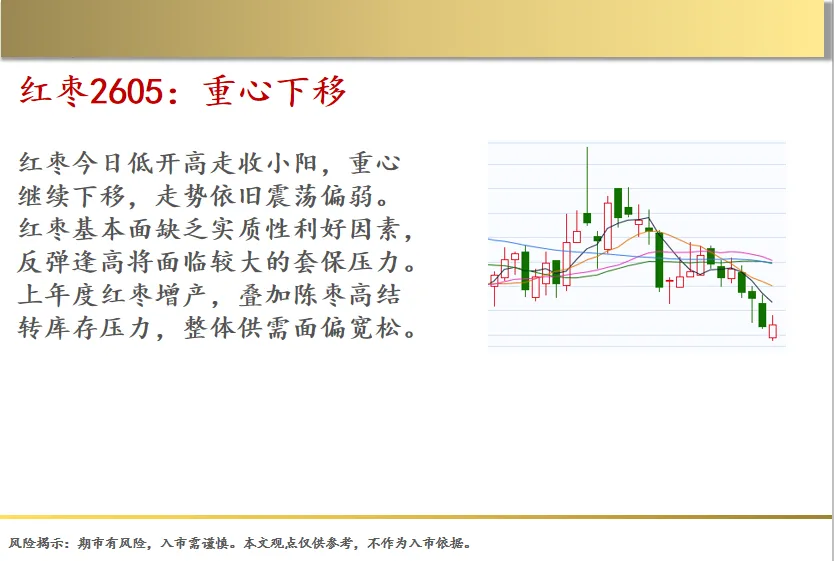 红枣今日低开高走收小阳,重心继续下移,走势依旧震荡偏弱。红枣基本面缺乏实质性利好因素,反弹逢高将面临较大的套保压力。上年度红枣增产,叠加陈枣高结转库存压力,整体供需面偏宽松。
