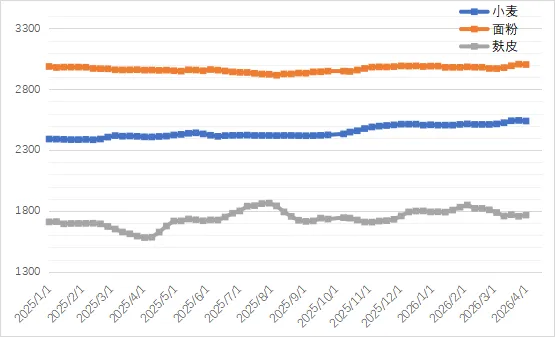 监测显示,截至4月1日,河南省小麦原粮进厂均价为2539元/吨,较上周下跌0.2%;面粉出厂均价为3003元/吨,下跌0.1%;麸皮出厂价为1766元/吨,上涨0.57%。