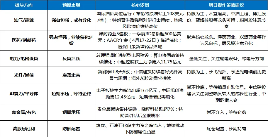 ○科技成长(半导体/算力):电子板块单日净流出超161亿元,短期情绪仍需消化。但中信建投指出,4月战争冲突对市场不利影响有望边际递减,建议关注前期调整幅度较大的有色、AI等成长性行业。