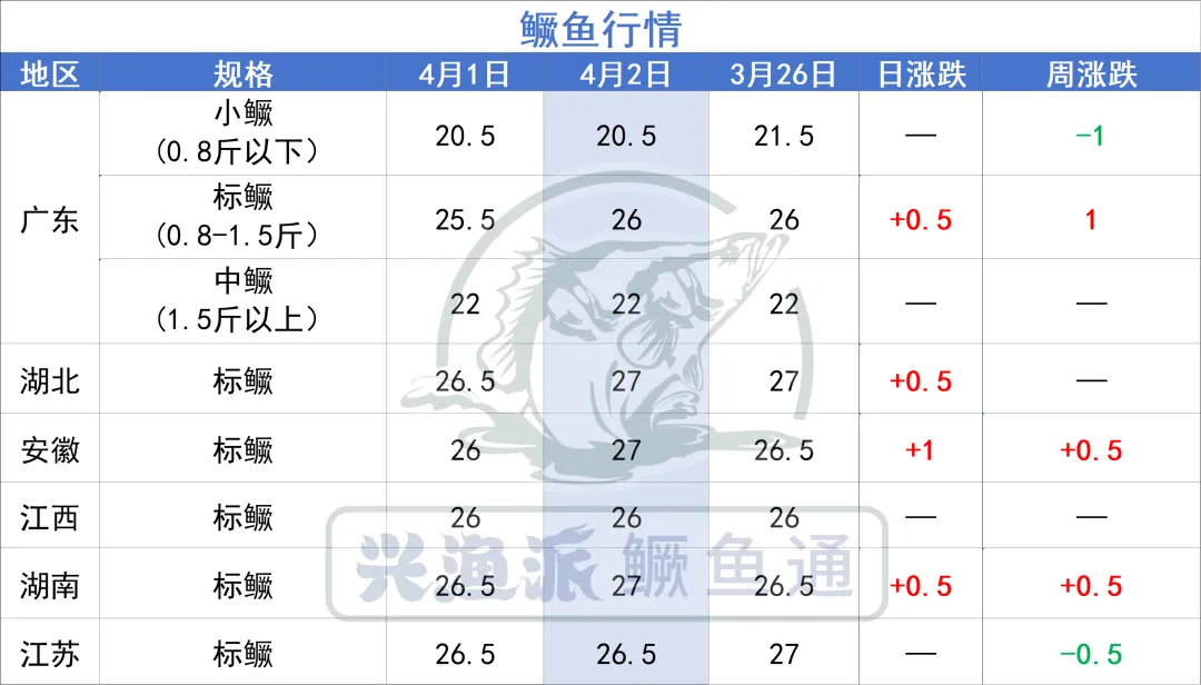 4月2日,广东鳜鱼涨0.5元/斤,湖北湖南涨0.5元/斤,安徽涨1元/斤。