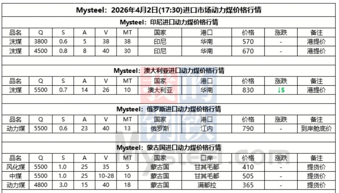 2日进口市场动力煤价格暂稳运行。近期市场交投冷清,需求端未有明显提振,终端用户拿货意愿不足,市场情绪回落,国际形势暂不明朗,不确定因素增多,煤价调整空间有限。国内外市场需求表现依旧分化,海外市场需求明显,对价格可接受度较高,一定程度支撑国际煤价坚挺;国内市场整体需求不济,传统淡季特征明显,发运成本高位下进口贸易商低价出货意愿较低,今日印尼Q3800巴拿马船型FOB主流报价区间仍在61-62美元/吨,下游还盘力度较大,实际成交困难,市场观望情绪蔓延,陷入僵持态势。预计短期内进口动力煤市场价格以稳运行,后市需持续关注外矿报盘及终端采购需求等情况。