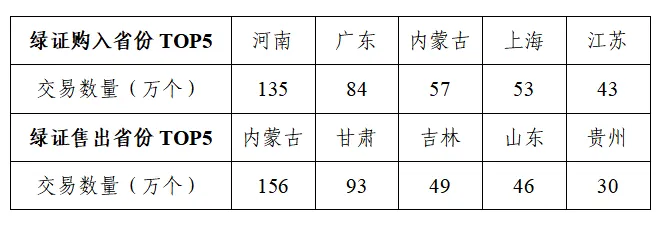 广州电力交易中心平台绿证交易购入省份排名前五为河南、广东、内蒙古、上海和江苏,绿证交易售出省份排名前五为内蒙古、甘肃、吉林、山东和贵州。