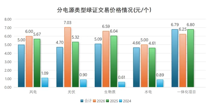 从不同电源类型绿证交易价格情况看,一体化项目成交价格最高,平均价格为6.79元/个;生物质项目次之,平均价格为5.09元/个。