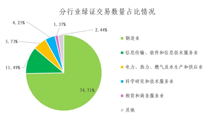 广州电力交易中心平台绿证交易数量排名前五的行业为:制造业(74.71%)、信息传输、软件和信息技术服务业(11.49%)、电力、热力、燃气及水生产和供应业(5.73%)、科学研究和技术服务业(4.25%)、租赁和商务服务业(1.37%)。
