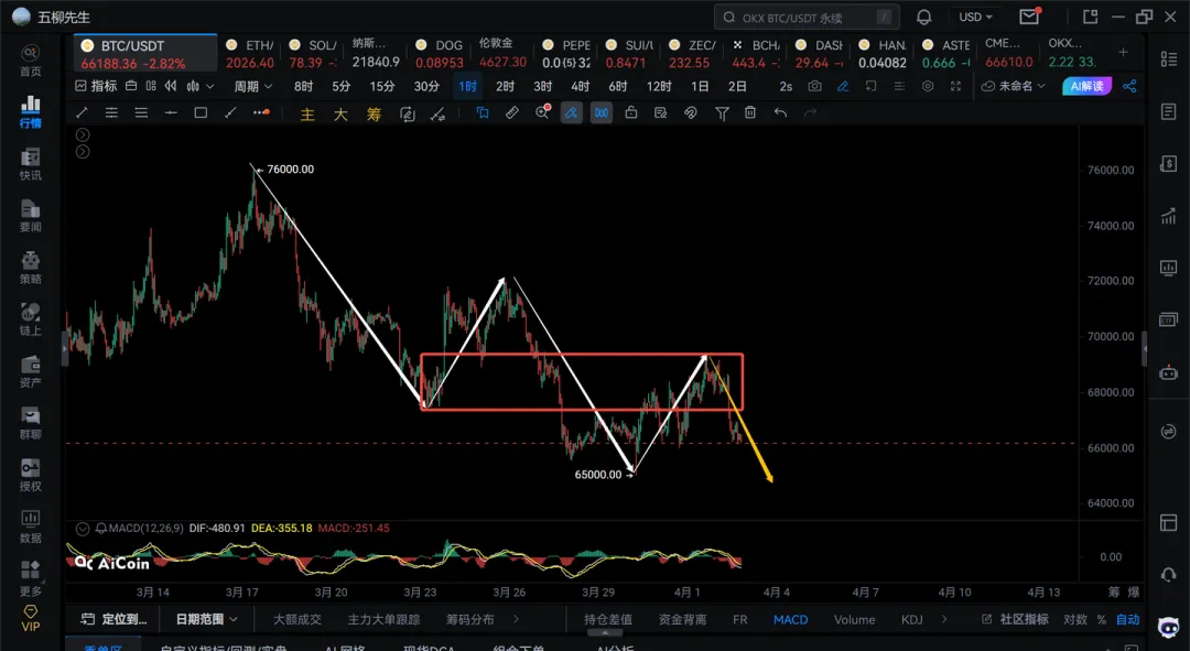 2)短线继续关注这笔1h级别的下跌的力度,看是否继续跌破65000