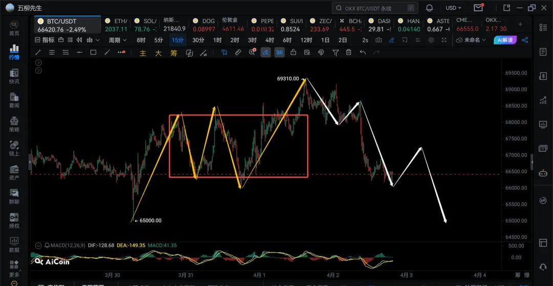 3)预期后续还会有第四笔15分钟级别的反弹和第五笔15分钟级别的下跌,重点是看接下来是否会跌破65000,破了则短期继续向下的概率大大增加