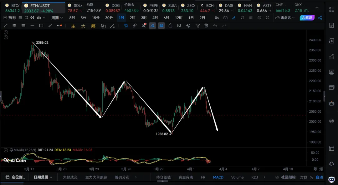 1) 以太虽然破了2155,但是奈何大饼这波反弹不给力。目前以太也是走一笔1h级别的下跌