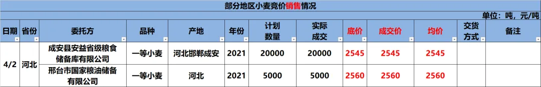 4月2日成安县安益省级粮食储备库有限公司销售2021年产一等小麦15000吨,起拍价格调整为2545元/吨,全部底价成交。4月2日邢台市国家粮油储备有限公司销售2021年产一等小麦5000吨,起拍价格调整为2560元/吨,全部底价成交。4月2日山东省储小麦销售0.33万吨,全部成交,成交价2540-2555