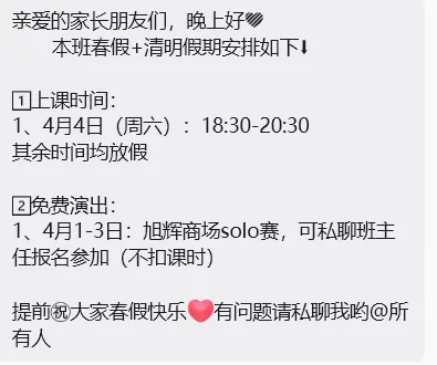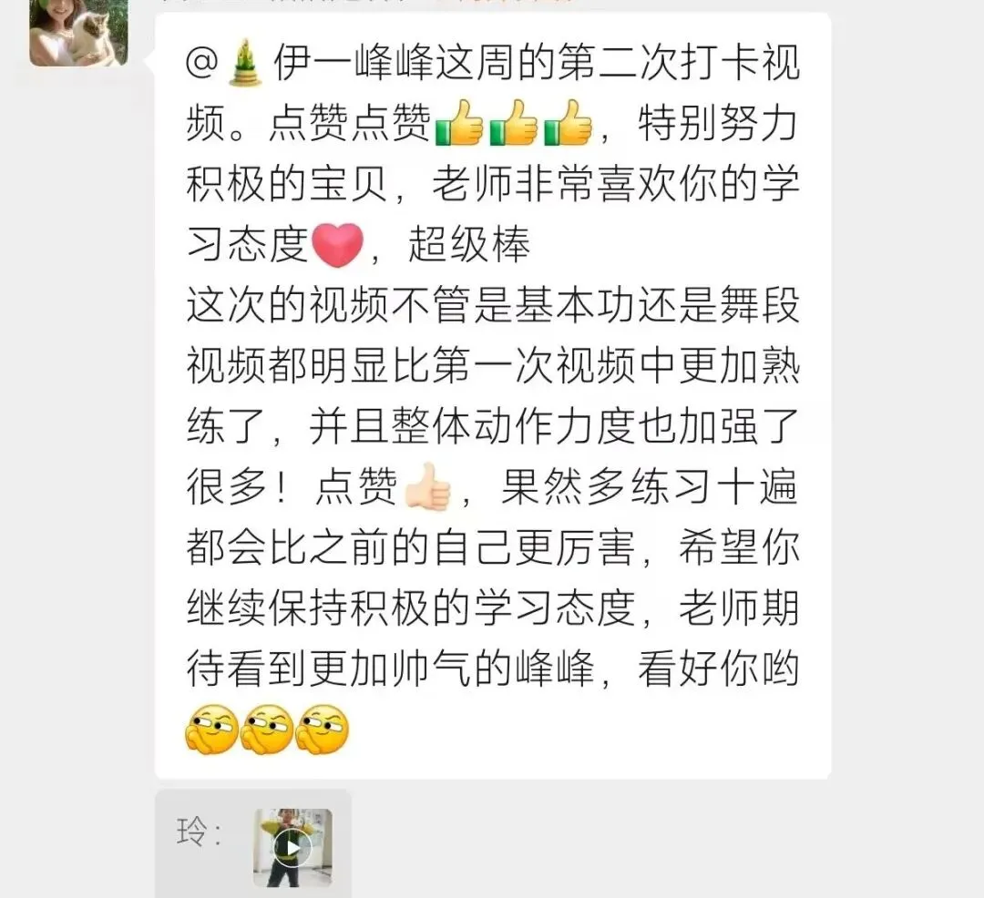 一周上一次课,一次两小时,下课就结束,回家没人盯、没人练,动作全靠课上那点记忆,效果自然很有限。每次课程结束,老师都会录制标准示范视频发到群里,让孩子每天在家对照练习、拍摄打卡。更难得的是,所有打卡视频,老师都会一对一细致点评,动作不到位、节奏不准、发力不对,都一一指出纠正,相当于免费给孩子加了长期答疑陪伴。对我们来说,这不再是简单的一节课,而是一整套完整的学习陪伴。二、免费舞台表演:把练习成果,变成孩子的自信