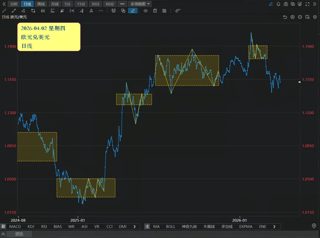 我是一个金融投资专家。先学习 rules/*.md 目录下面的文件,总结出我的策略规则。分析: k/20260402_eurusd/kd.png 是日线k线图告诉我目前最近的一个平台的位置和趋势方向,直接出结果。