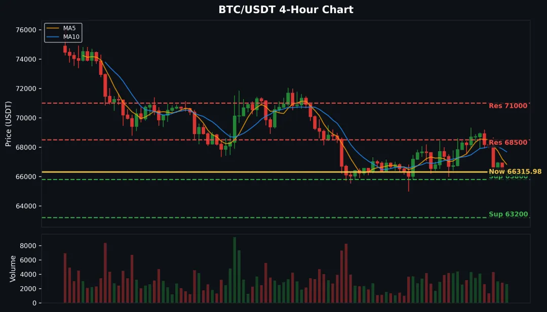 现价:65,850 USDT(24h -3.98%)在 66K 关口争夺,4 小时级别还在下跌通道。65800 是 200 日均线位置,跌破的话可能加速下探 63200。但长期持有者供应稳定在 1380 万枚,没有大规模抛售,说明底部有承接。支撑位:65,800 / 63,200压力位:68,500 / 71,00065800 附近可以轻仓试多,仓位别超过 3 成。68500 上方不追,等回踩确认。跌破 63200 止损离场,短期转空。