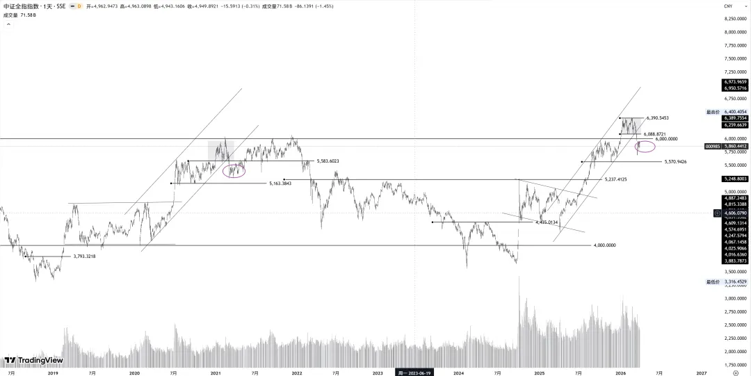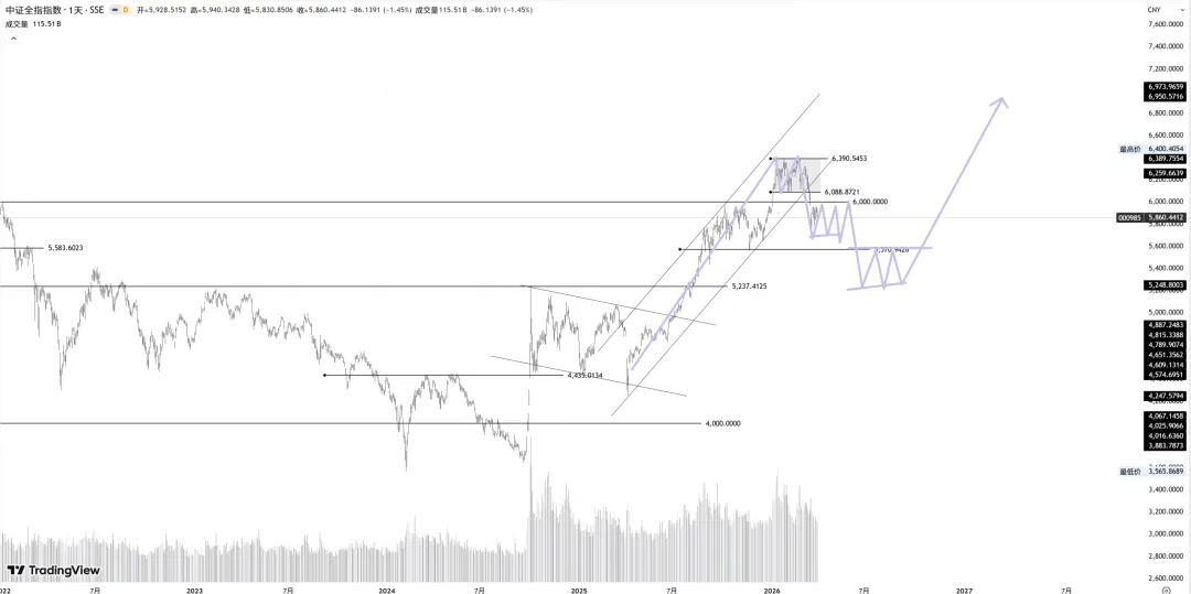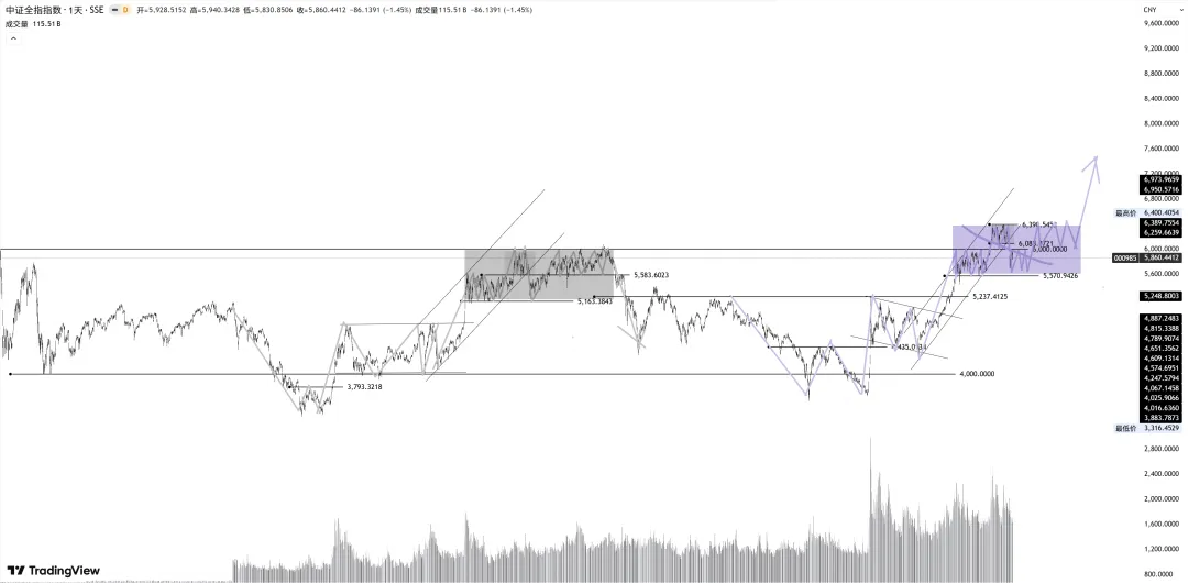 因为我之前有说这次牛市见顶,要么是规模够大的头部、要么是极速拉升之后的成交量够大的头部,比如说达到6万亿左右。所以我说现在肯定不能说牛市结束,但是如果这次震荡之后再往下走,那它的规模就够大、结构就够复杂了,这会给我们带来一点儿困扰。