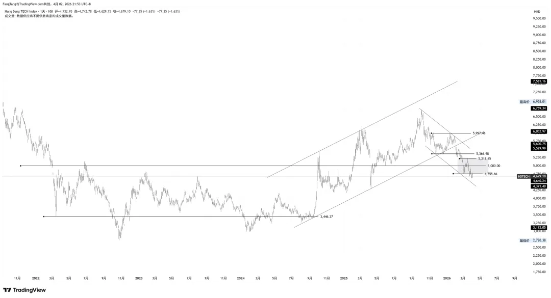 这个恒生科技也是一言难尽,这个基本上是又该止损了。这个从大的格局上来说,我还是偏向于这个附近是大级别低点的概率大。从风控的角度来说,也是该止损止损,重新站上站稳4750再说,以磨损换安全。如果是长线价投就另说了,这些都是核心资产,也并不贵。简直是全球科技板块的 “估值洼地”,我认为完全不必担心。