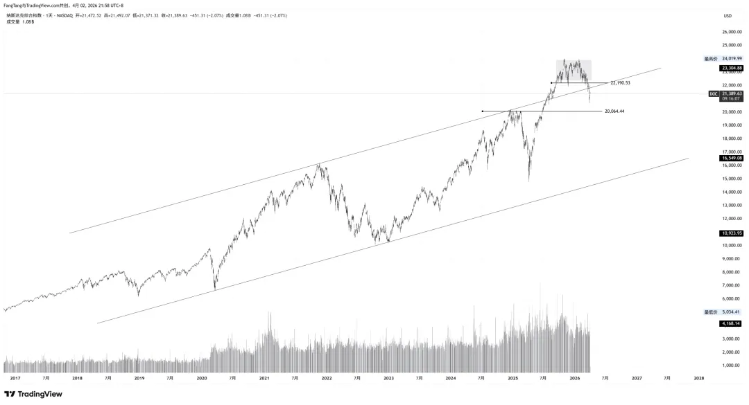 纳指还是维持原判,看跌到20000点附近先。它前面应该更多的理解为一个反弹动作。中期还是认为是一次调整,它的大牛市趋势没有改变。