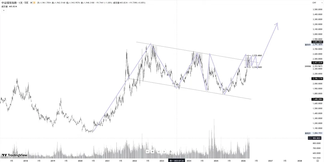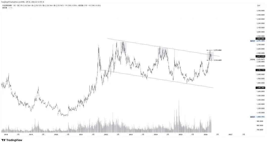 也就是中继震荡规模的进一步扩大,本质上是时间型调整。后续跟2021年不同,那年是最终往下跌破了。我还是认为这一次的牛市是不同的,它只是前半段比较相似。后续还是要往上突破的。