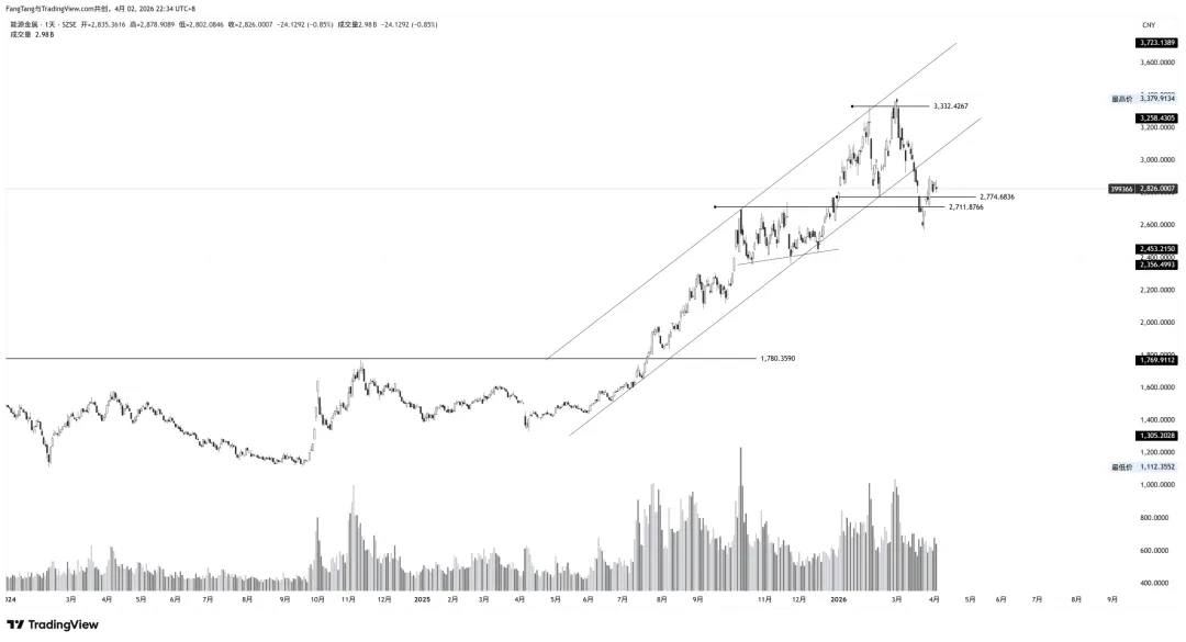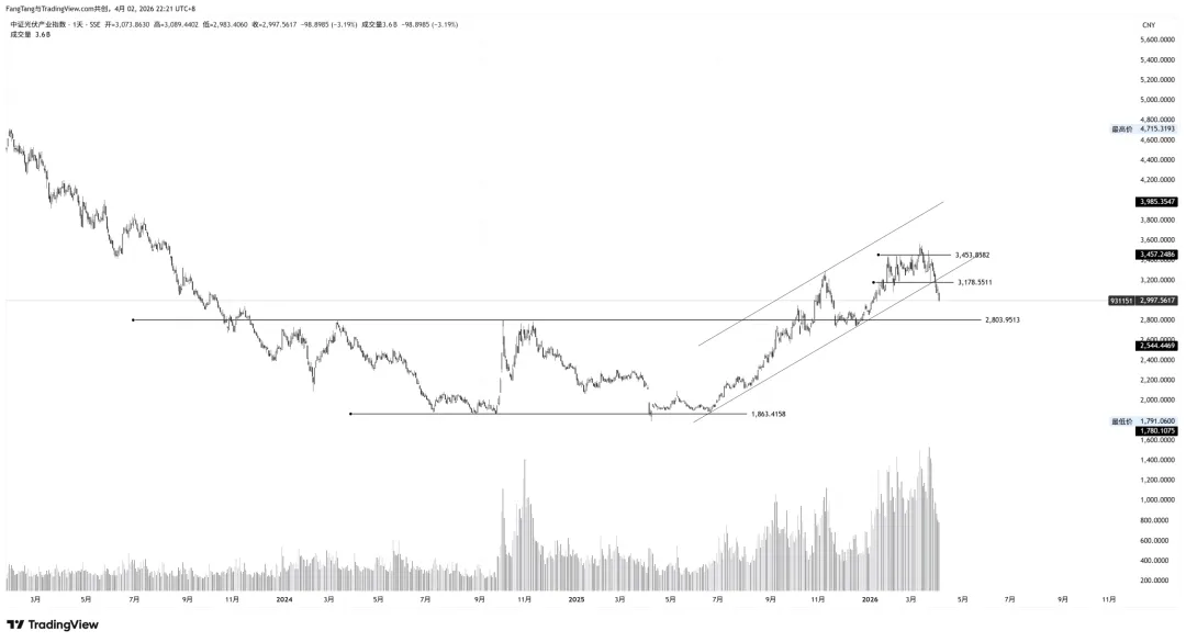 光伏这个基本上前面区间下沿摸一次就失败了,后面2800搏一次反弹,大概率能收回亏损。再往后这个行情也不能说结束了,它的底部是清楚的,这个也是要优先理解为震荡规模的扩大,而不是趋势的结束。