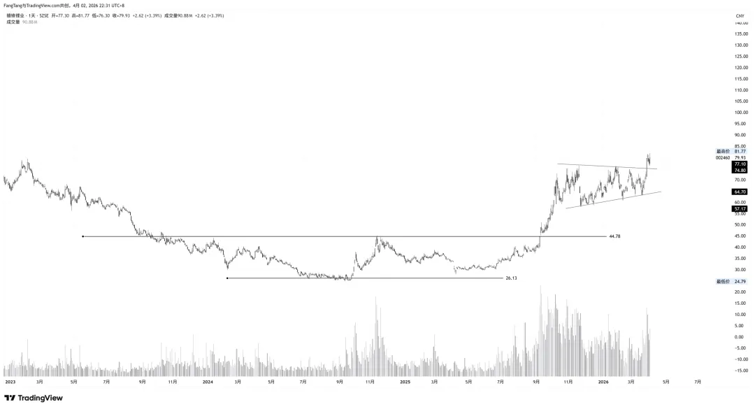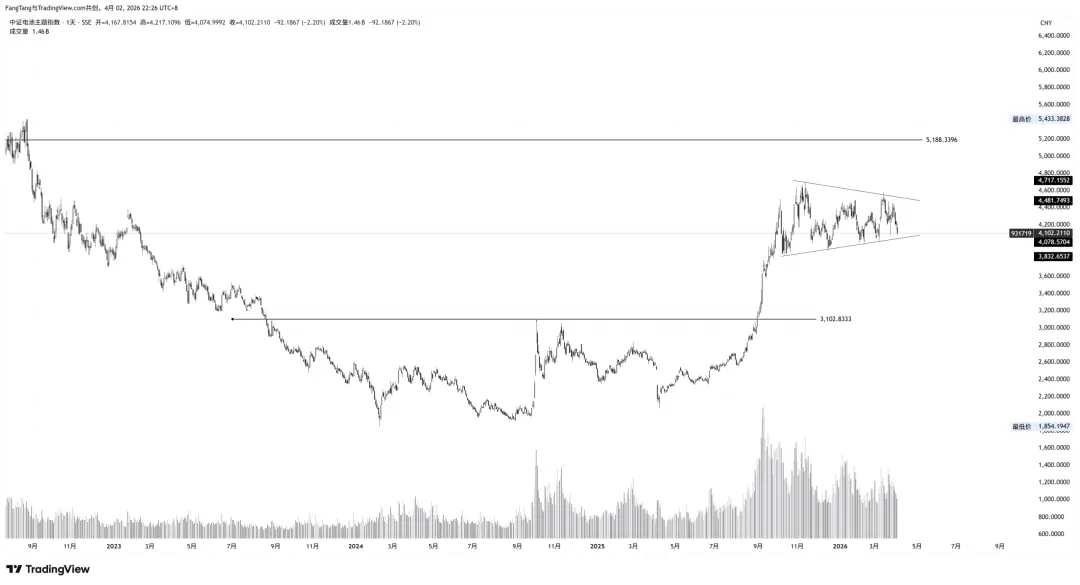 电池,这个前两天没有成功突破吖,又回到了区间下沿。这个玩意是这样的,他就跟我前面说赣锋一样。这个地方不能看跌,这是一个肯定要优先看涨的结构。而且目前整个大A,结构清晰、漂亮的板块都不多了,这玩意都属于优质货。