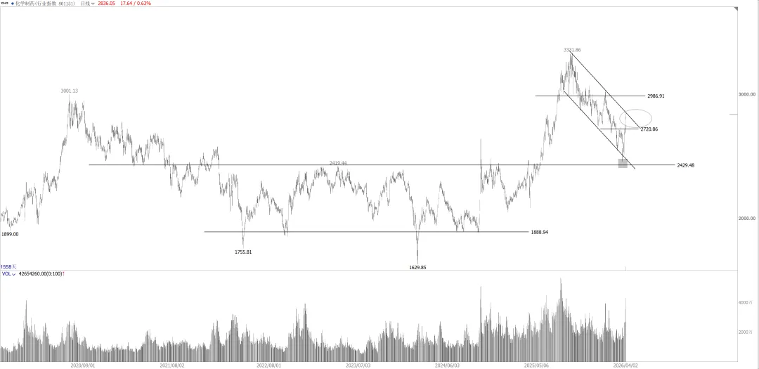 这玩意我前几天刚说它量已经到极低,最近应该要给一个大点儿的反弹了,今天就给了是吧,反弹看到2800。然后等等位置,这个板块我还是抱有希望的。我认为它的目前的头部过于仓促。