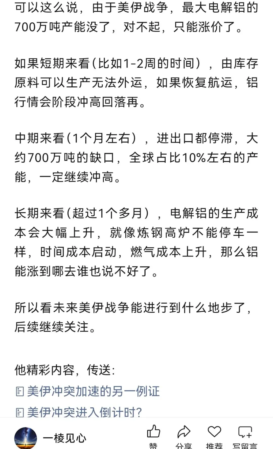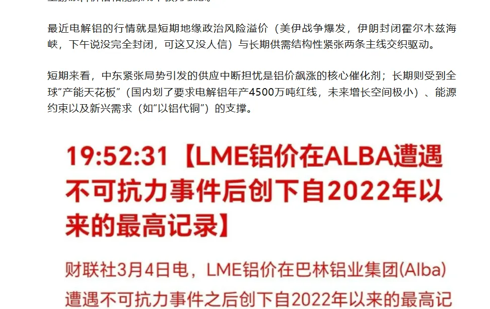 在之前的分析选择中电解铝与美伊战争,分析的整体铝行情是稳步上涨的,当时还在文中做了预测:要说对吧,国际市场铝行情火热,但是国内的表现与国外市场却存在巨大反差。近期国内铝市场,铝王和铝王平替(hqkg)确实表现不佳,针对HQ还多次做T,成本降了,但是还是5%不到的亏损状态。当时就挺疑问,美国铝业都是大涨,中东因为美伊战争巴林铝业等等受此冲突关停了部分的产能,照理国内也应该大涨才对。2、国内下游的消费端疲软,地产、家电、光伏以及新能源汽车等领域增速降低。3、成本上升,电力和氧化铝的价格上升速度要比成品电解铝的涨价更高。综合来说就是虽然国外行情火热,但是受限于国内环境,相同行业冰火两重天的景象,目前来说只能执行交易纪律MA120下方补仓做T,早日变红,加油!✨ 回复【关键词】解锁往期精选: