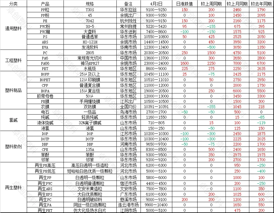 语2026-04-02行情汇总及展望,PP粒上涨150、PP粉无浮动、PE上涨150、PVC粉上涨95、PVC糊下跌100。塑料每日收盘汇总