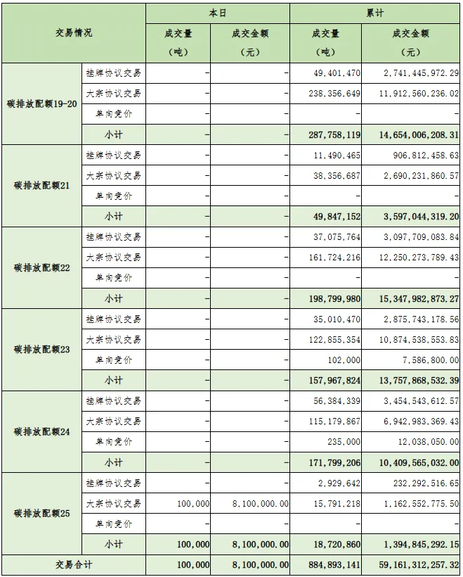 今日全国碳排放权交易市场成交总量100,000吨,成交总额8,100,000.00元,成交均价81.00元/吨。截至今日,全国碳排放权交易市场累计成交总量884,893,141吨,累计成交总额59,161,312,257.32元。