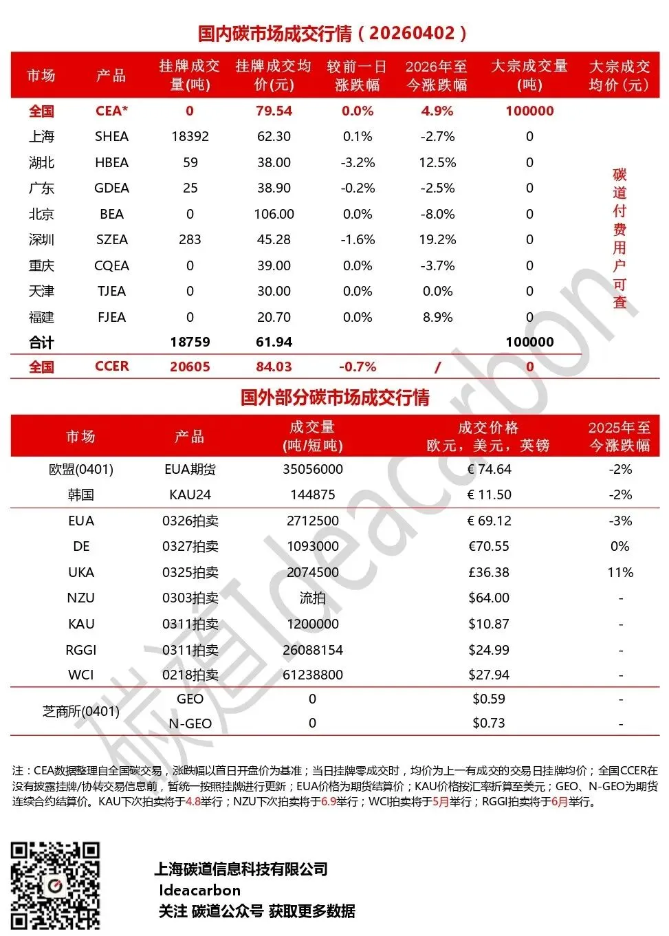 行情信息 | 2026年4月2日 全国碳市场清结算信息