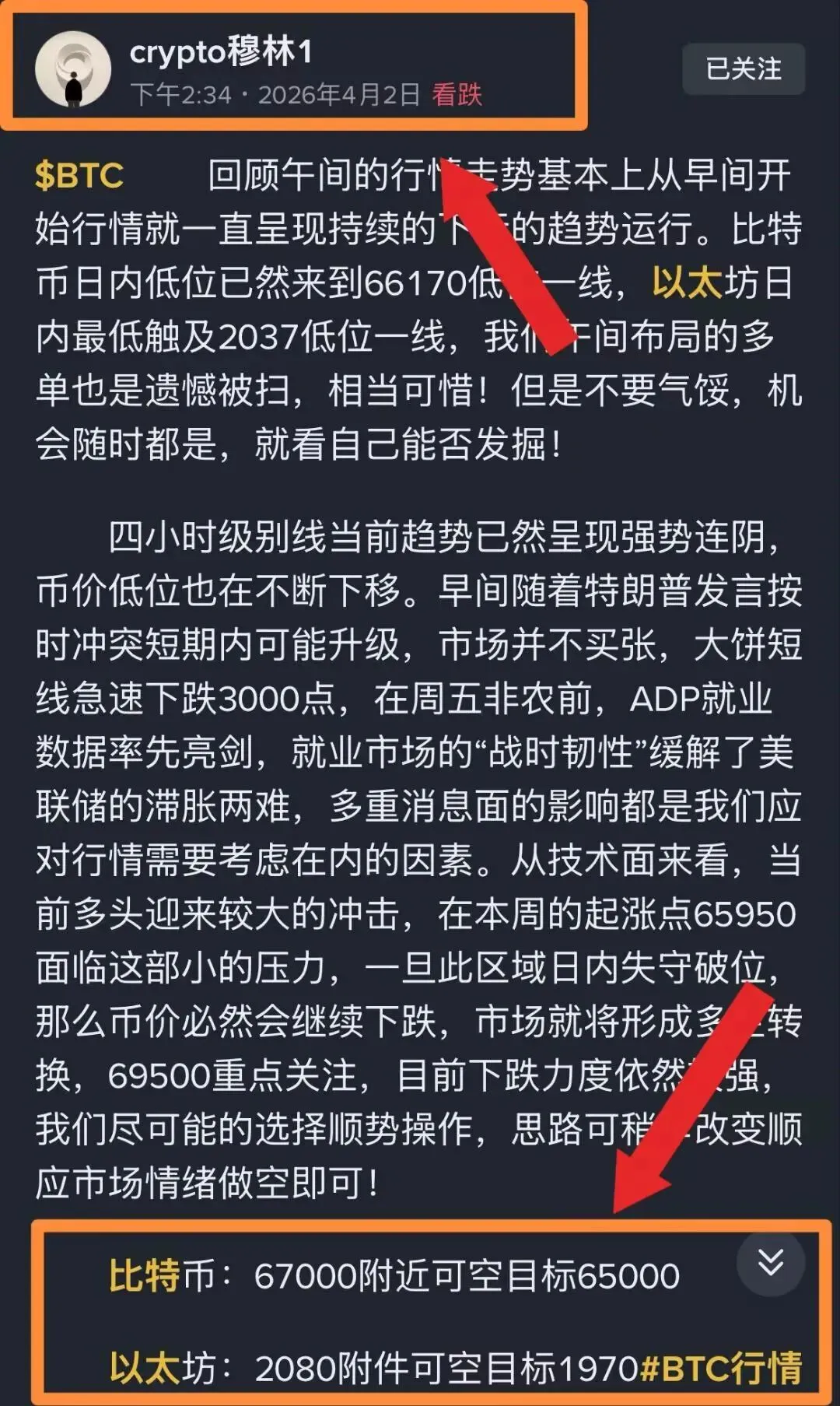 周四的行情也是走完收官,今天也是有些遗憾,带兄弟们损了一单。但是我们午后及时改变思路看空追空也是及时挽回损失!日内的行情走势基本呈现下跌趋势,反弹也并不强势,日内大饼最低回踩至65600低位一线后晚间随着美股的开盘迎来反弹收复,但力度依旧有所欠缺。以太坊方面日内最低回踩至2015低位一线。目前回暖至2060附近运行。