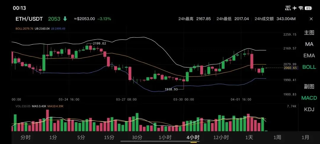 ETH/USDT 报价 2,053 美元(24小时跌幅3.13%),结合布林带、均线及晚间非农数据变量,给出以下操作建议: