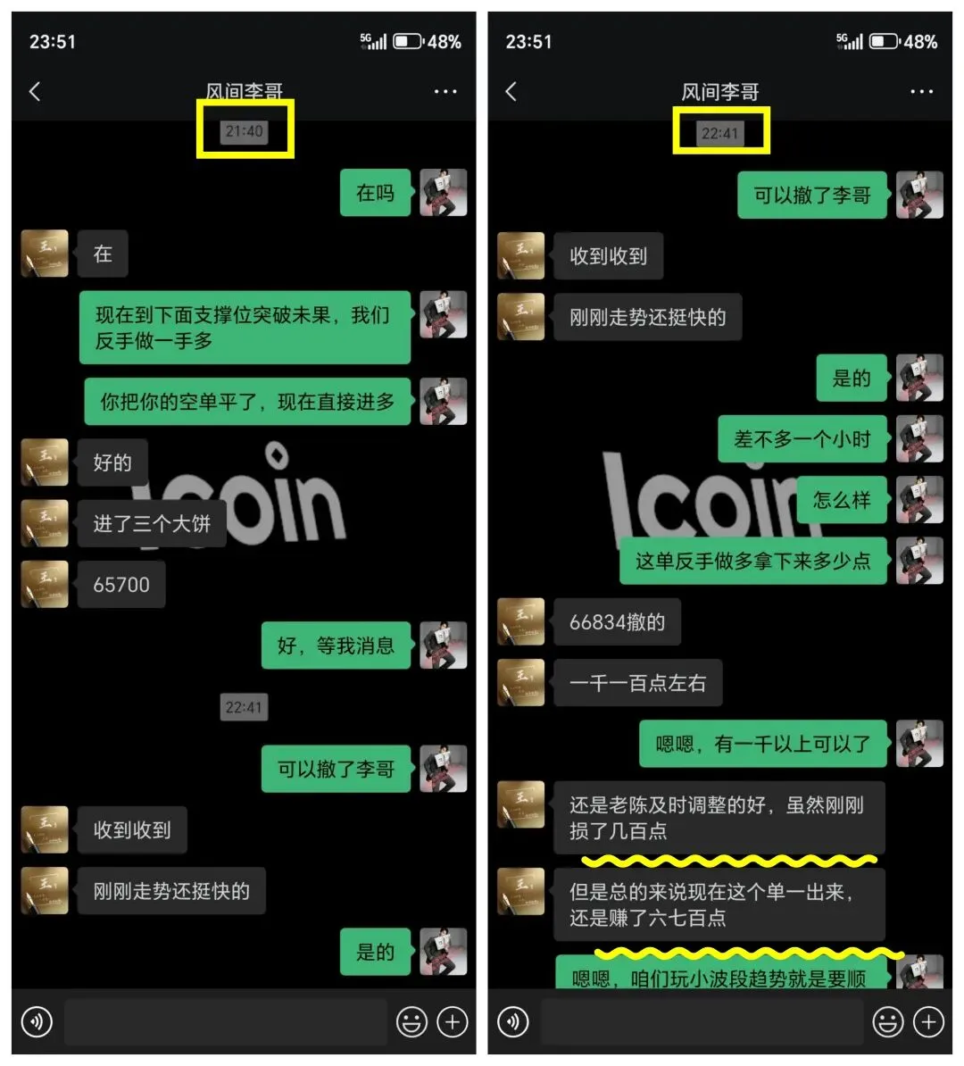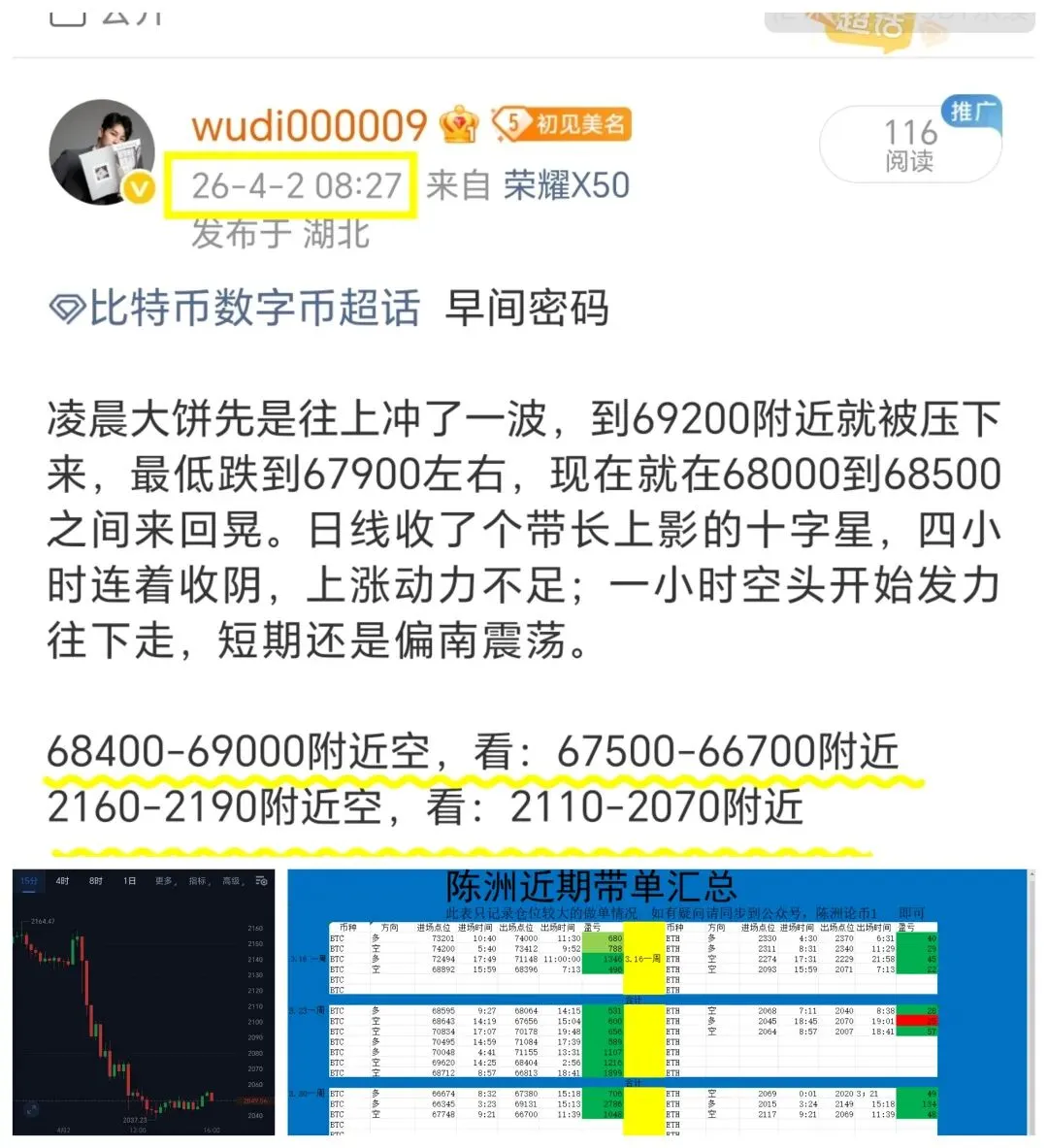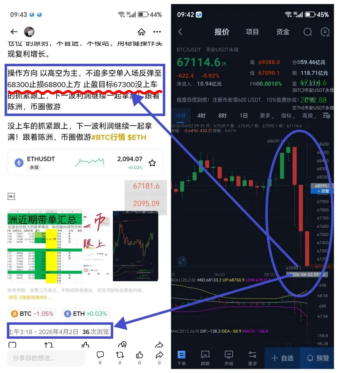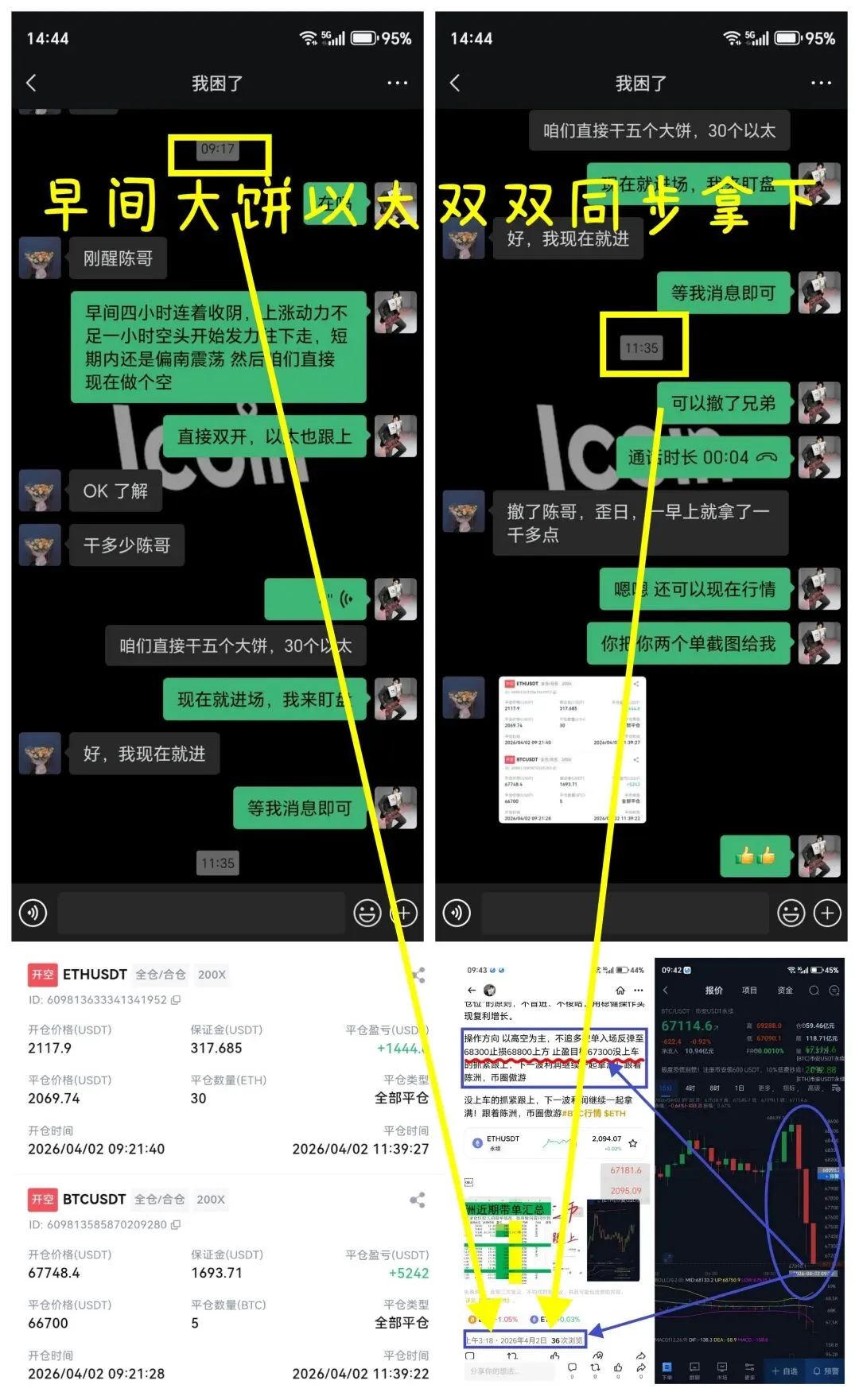 9:17指导学员进场,大饼开仓67748.4,以太开仓2117.9,双开空单布局。11:35准时通知止盈离场,最终大饼66700平仓,净赚超1000点;以太2069.74平仓,完美命中目标区间。