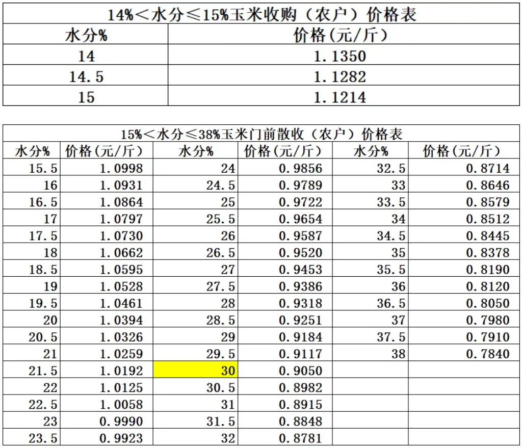 2.门前“带票”价格:新粮14%<水分≤15%三等及以上玉米折标价格为2280元/吨;15%<水分≤38%玉米折标价格为2250元/吨;该价格为筛混不返杂价格;需提供发票(9%税率);发票入账后10个工作日内付款。