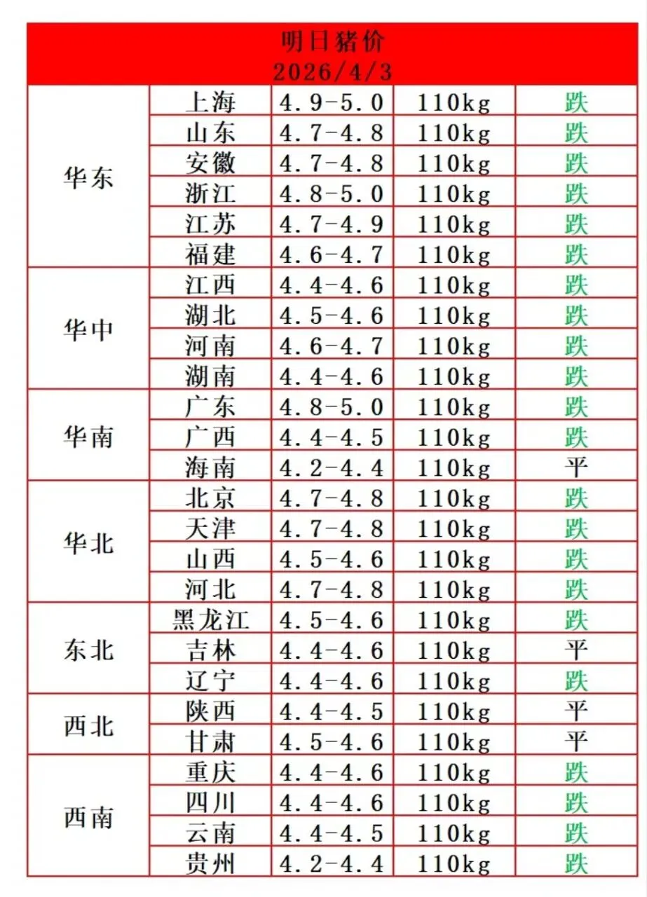 2026年4月3日全国生猪价格行情新鲜出炉,从最新报价来看,国内生猪市场整体延续低迷态势,全国绝大多数地区猪价全线下跌,仅少数地区价格持平,市场下行压力显著。