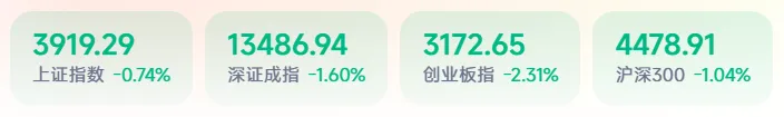 三大指数全线收跌,沪指跌0.74%,收盘报3919.29点,盘中一度跌破5日线和10日线,尾盘靠着权重护盘,才勉强收在5日线附近;深成指跌1.60%,创业板指跌2.31%,科创50更惨,直接跌了2.77%,两大成长指数双双创下调整新低。