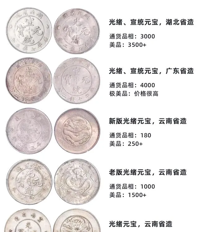 图里最下面的,是光绪元宝,云南省造,看着样子厚重又笨拙,龙鳞细密,外圆内方,收藏市场俗称“西南肥龙”,售价跳得明显,品相再好点的随随便便就是两三千。有时候遇到藏家反复拿在灯下照,笑说“这龙比现在的纪念币气场足”,那神情还真有点炫耀的味。