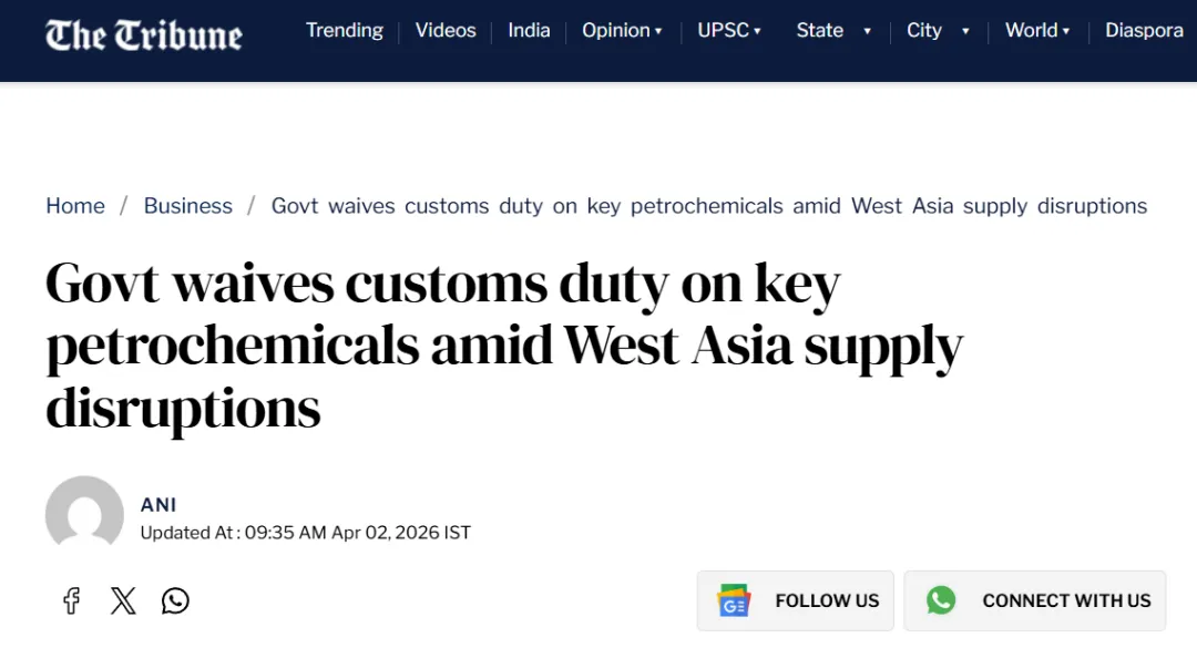 新德里4月2日讯,印度政府宣布,为应对西亚冲突引发的供应链中断,对数十种关键石化产品实施零关税,措施有效期至2026年6月30日。