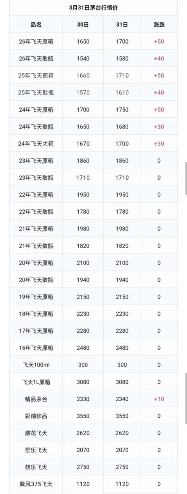 最新数据显示,3月31日飞天茅台的行情价明显上扬,尤其是26年、25年和24年的原箱产品,每瓶涨幅都在50元左右。以26年原箱为例,从1650元飙升到1700元,这一幅度在过去几个月中并不多见。散瓶方面,26年和25年的涨幅也达到了40元,而一些散瓶甚至出现了30元的小幅回落——这或许反映出市场逐步趋于平衡的迹象。